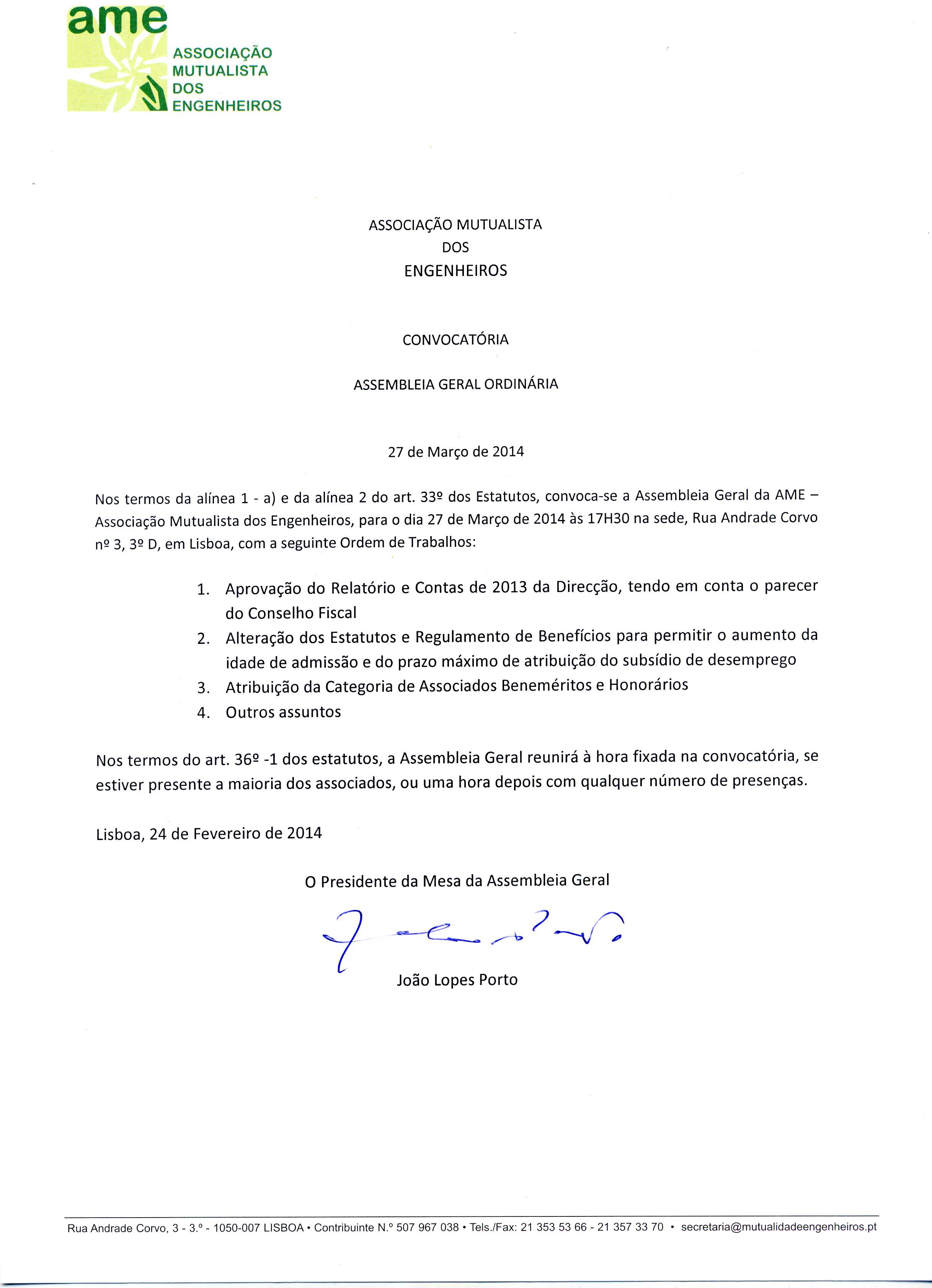 Vai realizar-se no dia 27 de Março de 2014 às 17H30 a Assembleia Geral Ordinária da AME, para aprovação do Relatório e Contas relativos ao exercício de 2013, de acordo com a Convocatória anexa.