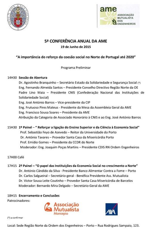 Teve lugar no passado dia 19 de Junho na sede da Região Norte da Ordem dos Engenheiros, no Porto, a 5ª Conferência Anual da AME, subordinada ao tema “A Importância do reforço da coesão social no Norte de Portugal” que teve como um dos pontos altos, na sessão de abertura, presidida pelo General Frutuoso Pires Mateus, a atribuição do Título de Associado Honorário da AME, ao Engenheiro José António Ferreira Barros, personalidade cujo carácter e dedicação aos valores da solidariedade e ao desenvolvimento de Instituições socio-culturais, merece esta homenagem. A Sessão foi aberta pelo Presidente da Região Norte da Ordem dos Engenheiros, Eng. Fernando Almeida Santos, que destacou a grande satisfação da Conferência Anual da AME se realizar pela segunda vez no Porto. No final da Sessão o Presidente da Direcção da AME, Eng. Francisco Sousa Soares, sublinhou a importância da cooperação entre as diversas Entidades da Economia Social com as Instituições da Ciência e do Ensino Superior, tendo em vista o reforço da coesão social na região Norte de Portugal, no momento de arranque de um novo quadro de fundos comunitários - Portugal 2020.
