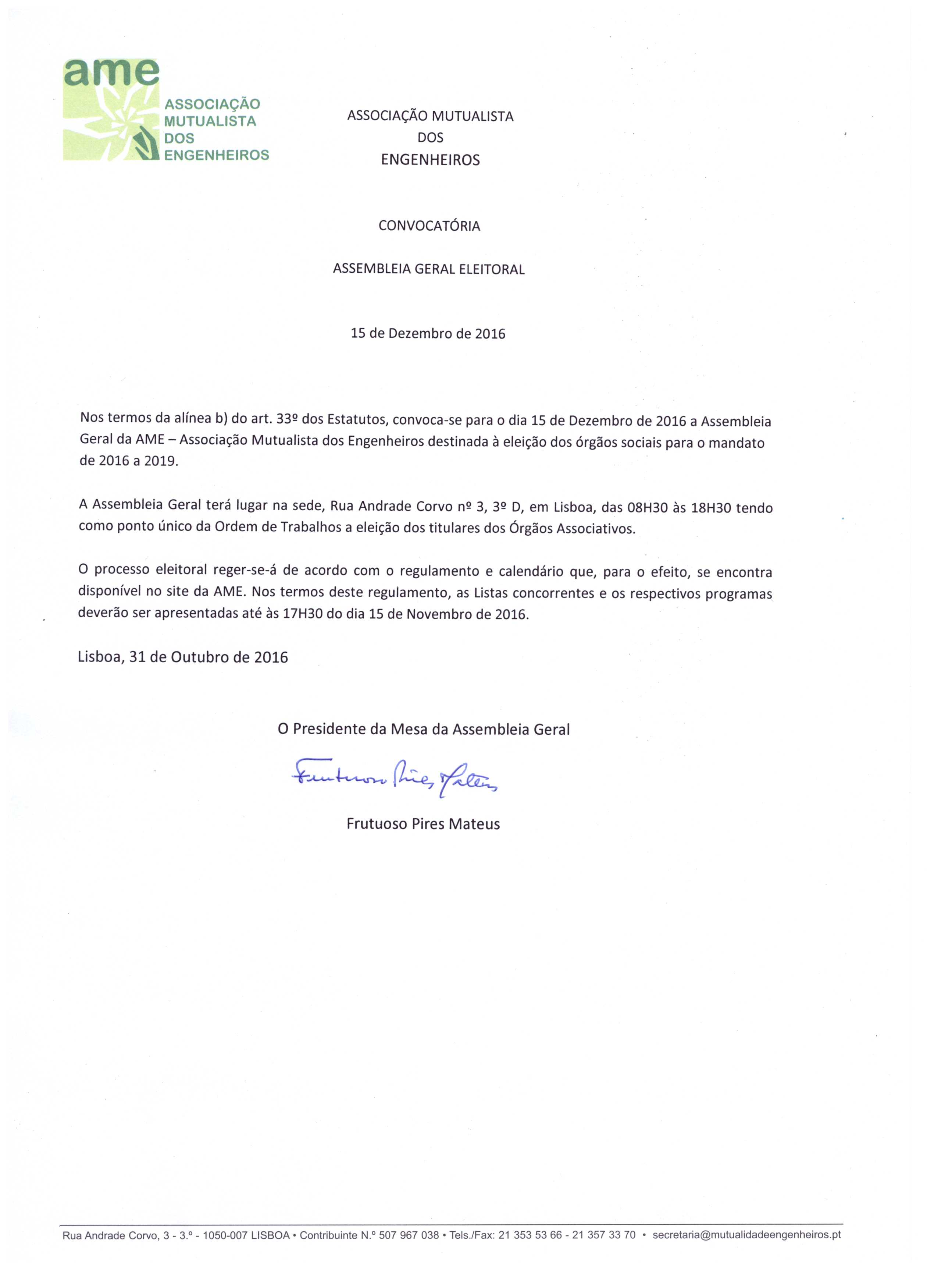 A Assembleia Eleitoral dos Orgãos Sociais da AME para o mandato 2017/2019, terá lugar no dia 15 de Dezembro de 2016, das 08H30 às 18H30.