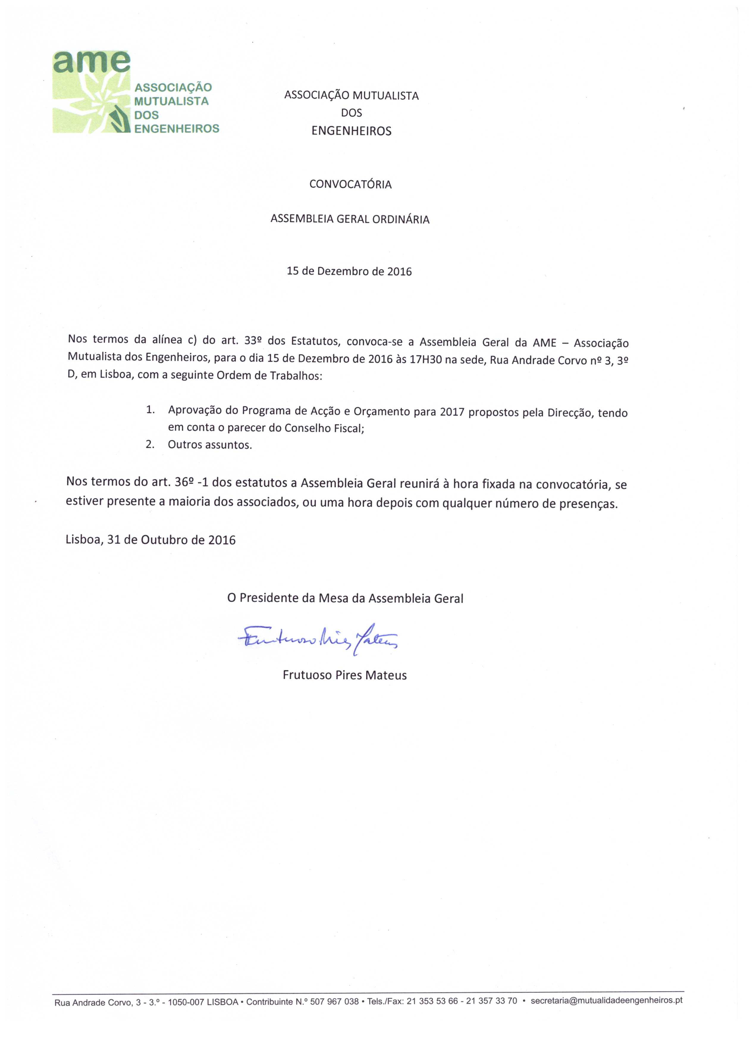 ASSEMBLEIA GERAL DA AME EM 15 DE DEZEMBRO 2016