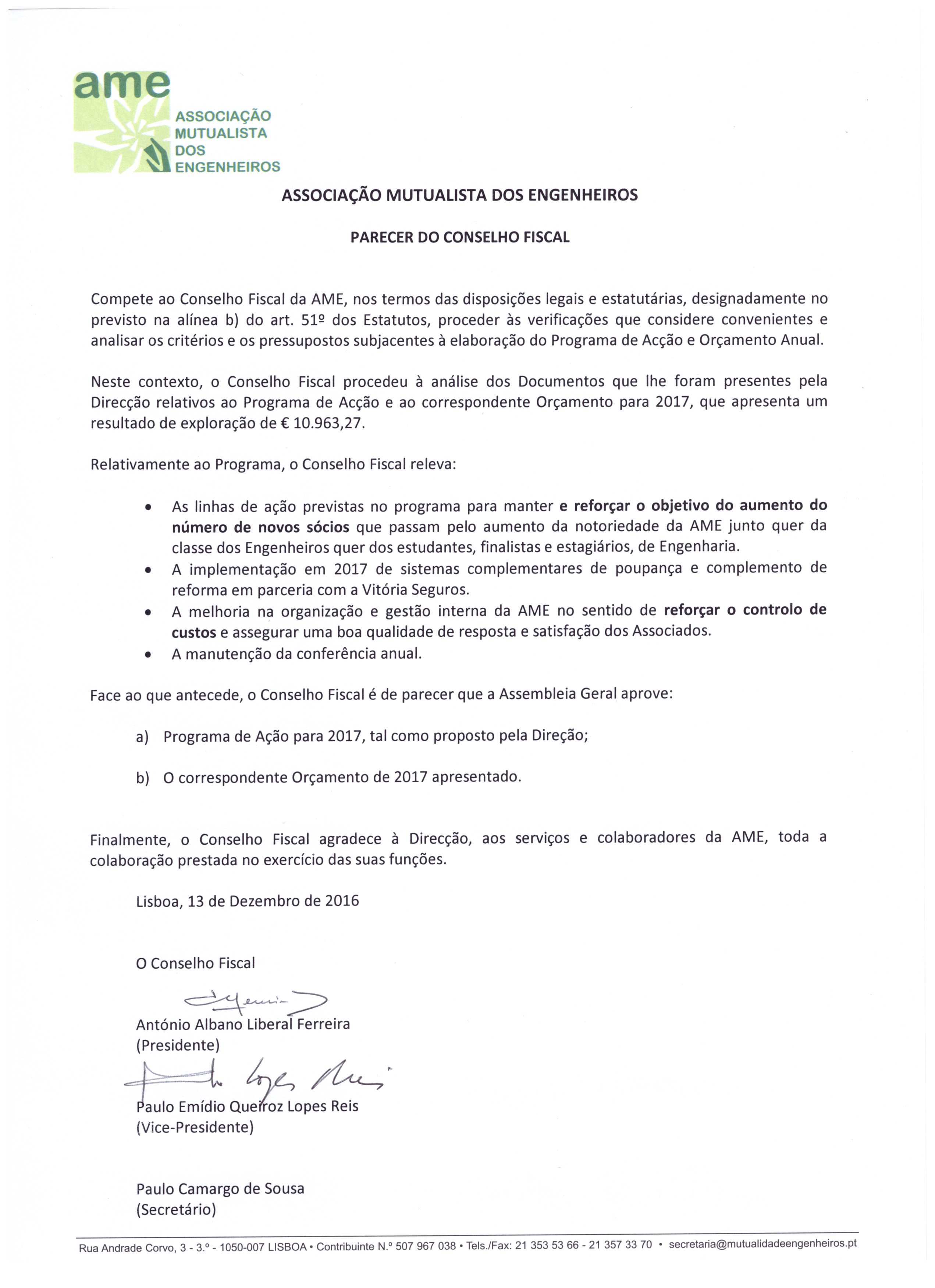 Realizou-se no dia 15 de Dezembro de 2016, pelas 18h30, na sede da AME na Rua Andrade Corvo nº3 3ºDto em Lisboa, a Assembleia Geral Ordinária da AME, de acordo com a convocatória e os documentos anexos.